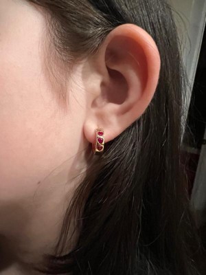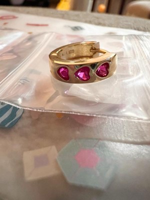 Guili Kids?/Teens Triple Stone Round Hoop Earrings in 14k Yellow Gold Plating with Heart Pink Cubic Zirconia, A Romantic & Timeless Design