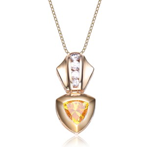 This is a stunning sterling silver pendant that has a large lemon-colored stone in the middle with a gold- plated frame and intricately designed upper body with a few white cubic zirconia stones. Like a modern piece of art, this could be a worthwhile accent to your modern casual outfit.