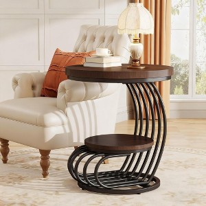This 2-tier round end side table (Rustic Brown) blends vintage warmth with practical functionality, making it a standout addition to any home. Its rustic brown wood tabletop (with natural texture) and unique arc-shaped metal frame infuse spaces with cozy sophistication, while the 2-tier design maximizes storage: the upper surface showcases decor, and the lower shelf keeps daily essentials organized. At 19.69" x 24.8", it's compact enough for small apartments or tight rooms yet sturdy enough for daily use--thanks to its thickened particleboard and 6-curved-tube metal frame (with a stable circular base to avoid tipping). Assembly is stress-free with labeled parts and clear instructions, and professional support ensures peace of mind. Whether used as a sofa side table, bedside nightstand, or entryway accent, it balances style, sturdiness, and convenience--ideal for anyone looking to add a touch of rustic charm to their decor.