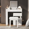 This 3-in-1 white vanity desk maximizes functionality and space, fitting seamlessly into home routines as a makeup station, writing desk, and nightstand. Its flip-top mirror (with 135¡ã hydraulic hinges and 3 touch-controlled LED modes) ensures safe, well-lit makeup application, while closing the mirror transforms it into a practical workspace. The retractable side cabinet extends to hold bedtime essentials and retracts to save space, suiting any room layout. It offers abundant organized storage¡ª5 drawers, a jewelry compartment, and a 3-layer shelf¡ªto eliminate clutter. Crafted from durable solid fiberboard, it comes with a soft-cushioned, solid wood stool for comfort, making it a stylish, multi-purpose addition to any bedroom.