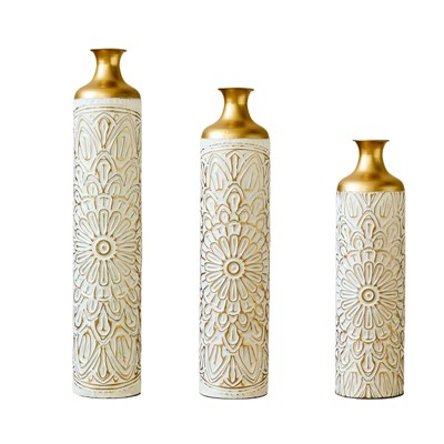 Gulches delivers a stunning 3-piece metal vase set that infuses your home with glamorous elegance, perfect for living rooms, bedrooms, or entryways. Each set includes three tall, slender cylindrical vases (23.6", 27.5", 31.5" tall) with a 6-inch diameter, featuring funnel-shaped necks, mouth openings, and triangular embossed body patterns¡ªblending modern design with tactile texture. Crafted from pure metal with a durable glazed finish, the gold and white color scheme exudes luxury, complementing a wide range of interior styles from modern to glam. Weighing 15.2 pounds total, the vases offer reliable stability with weighted bases, preventing tipping. Versatile in use, they shine as standalone decor pieces, tiered displays, or floral centerpieces, adding a sophisticated touch to everyday home decor or special occasions.