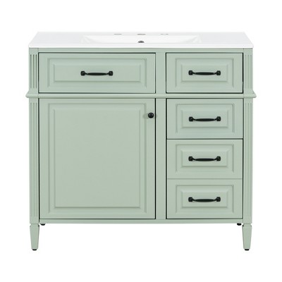 Gulches 36 Inch Green Bathroom Vanity with Sink Solid Wood MDF Cabinet 3 Drawers 2 Doors Flip Drawer Golden Metal Handles Modern Storage