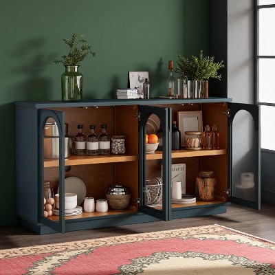 Gulches 4 Door Large Storage Buffet Cabinet with Glass Doors Arched Design Adjustable Shelves for Kitchen Dining Room Living Room Blue