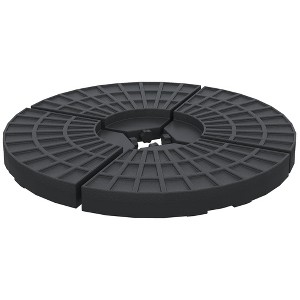 Gulches 4-piece black round umbrella weights fit offset, cantilever, and market umbrellas (residential use). Each holds 28.6 lbs water, 33 lbs sand, or 38.5 lbs sand-water mix (112 lbs total sand). 4 separate pieces secure over crossbars. Durable HDPE with weather/UV resistance. Center spouts with twist-off caps for easy filling/draining. Recommended: Dry sand + water for extra weight.