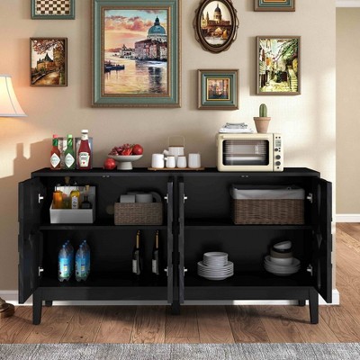 Gulches 60.5" Walnut Mid Century Sideboard Buffet combines warm vintage style and practical storage. Its walnut finish and 4 doors add mid-century charm, while adjustable shelves customize storage for essentials. Crafted from solid wood and P2 grade MDF, it¡¯s durable and moisture-resistant. The 2 built-in outlet holes keep wires organized, and its versatile design fits living rooms, dining rooms, or entryways as a TV media console, buffet, or storage cabinet¡ªeasy to assemble and clean.