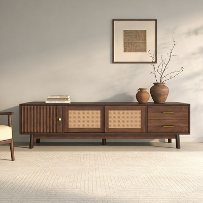 Gulches 71 Inch mid century modern TV stand features walnut wood finish and black metal frame fits TVs up to 75 inches it has large drawer sliding doors adjustable shelves for versatile storage cable management holes reduce clutter anti tip device ensures safety pre drilled parts and hardware enable easy assembly ideal for living room with modern or transitional decor