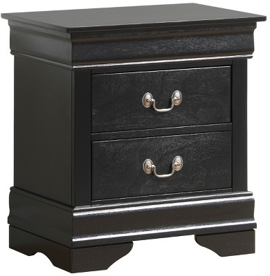 Add timeless sophistication to your bedroom with this Gulches Black Nightstand featuring classic Louis Philippe styling. Measuring 21 5/8"W x 15 3/4"D x 23 3/4"H, this transitional piece combines elegant design with practical storage. The English dovetail drawer construction ensures lasting durability, while antique brass hanging pulls add refined detailing. Perfect for keeping bedside essentials organized, this nightstand elevates any bedroom with its rich black finish and sturdy bracket feet.
