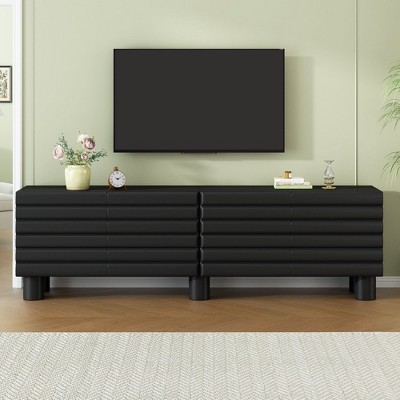 This Gulches black TV stand entertainment center is a stylish functional addition to living rooms blending unique design and practicality Crafted from durable MDF with high quality hardware it has elegant wavy door panels and sleek cylindrical legs adding modern flair and sophistication The solid black finish matches various decor creating a refined look The stand is 70 inches wide 14 inches deep 22 inches high fitting TVs up to 75 inches Overall capacity is 595 pounds table top holds 330 pounds each shelf 44 pounds ensuring stable support It has four spacious cabinets each 16 inches wide 12 inches deep 16 inches high with fully adjustable shelves for entertainment essentials DVDs and more keeping space clutter free Eight cable management holes organize cords from TV and devices hiding them for a tidy look Thick door panels and 5 inch PVC legs boost durability an anti tip feature secures to wall preventing tipping Assembly needs two people takes about two hours adult assembly required power drill recommended not included Manual measurements may have slight errors board finish may vary in color texture veining lighting and display may cause chromatic aberration these are not defects This stand combines unique design ample storage cable management quality and safety upgrading your living room stylishly