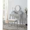 Elevate your daily beauty routine with the Gulches Chic Vanity Table Set, designed to combine elegance and functionality. This stylish silver vanity features an adjustable oval mirror, allowing you to achieve the perfect angle for makeup application. With five lined drawers, it offers ample storage for your jewelry, cosmetics, and accessories, keeping everything neatly organized. The smooth tabletop provides additional space for your beauty essentials, while the matching stool with a padded seat ensures comfort. Measuring 32"W x 16"D x 53"H, this set is a sophisticated addition to any bedroom decor.