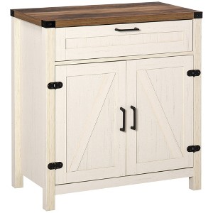 Gulches Farmhouse white sideboard blends rustic charm with functionality. It features 2 barn doors with retro hardware, a pull-out drawer, and a double-door cabinet with an adjustable shelf ideal for organizing utensils, plates, and small items. Versatile for dining rooms, kitchens, or living rooms. Made of sturdy particleboard (easy to clean) with decorative corner covers. 30"W x15.25"D x32.75"H; total capacity 65lbs.