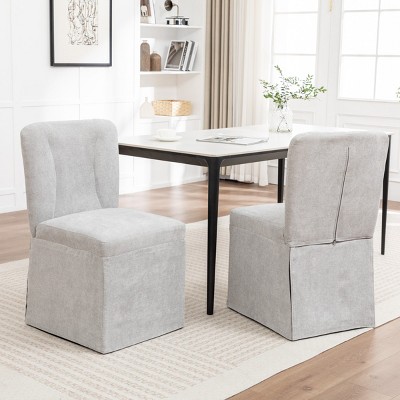 Gulches Gray Linen Dining Chairs Set of 2 Modern Fabric Side Chairs with Padded Seat and Backrest for Dining Room Kitchen and Living Room is a versatile and stylish addition to your home This set includes two chairs each designed with a minimalist aesthetic that seamlessly complements various interior styles The chairs are exquisitely crafted from a mix of materials including an iron frame wood board and linen combining durability with fashion Each chair offers ample space and a padded seat and backrest for exceptional comfort The chair legs are made with iron craftsmanship ensuring stability and a maximum weight capacity of 250 pounds The chair feet are equipped with anti slip pads to protect your floors from scratches With a compact size these modern dining chairs can be used as kitchen chairs leisure chairs living room chairs dining chairs or dressing stools providing a comfortable sitting experience anytime and anywhere Each chair measures approximately 32 inches in height 18 inches in width and 20 inches in depth The set includes two chairs perfect for enhancing the comfort and style of your dining room kitchen or living room