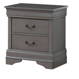 Enhance your bedroom with this elegant Gulches Gray Nightstand featuring classic Louis Philippe styling. Measuring 21 5/8"W x 15 3/4"D x 23 3/4"H, this transitional piece combines sophisticated design with functional storage. The English dovetail drawer construction ensures lasting durability, while antique brass hanging pulls add refined detailing. Perfect for keeping bedside essentials organized, this nightstand elevates any bedroom with its versatile gray finish and sturdy bracket feet.