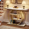 Gulches 41.3" industrial console table (White) features a circle metal base & 4 staggered tiers. 1.57" thick top (holds 100lbs) + metal frame ensures sturdiness; adjustable pads fix wobble. Fits as console/tea/entryway/TV table. Easy assembly with clear instructions.