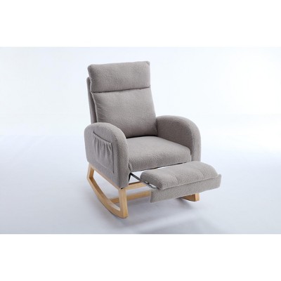 This Gulches light gray teddy fabric nursery rocking chair is a versatile addition to any home. Its soft teddy upholstery and foam filling deliver plush comfort, while the adjustable footstool and thickened headrest enhance relaxation for allday use. The gentle 15¡ã forward/backward rocking motion creates a calming atmosphere, perfect for soothing babies, reading, or unwinding. The solid wood base with felt pads protects floors and minimizes noise, and antitip foot nails ensure stability and safety. A rightside storage pocket keeps essentials within reach, and it supports up to 250 lbs. Easy to assemble in 30 minutes by one person, it¡¯s suitable for nurseries, bedrooms, or living roomsblending seamlessly with any decor style.