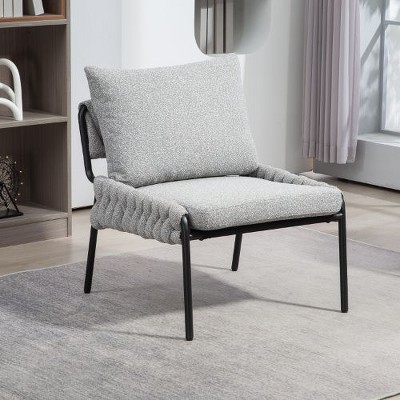 This grey modern accent lounge chair blends comfort, style and durability for versatile home use. Its ergonomic design features a plush cushioned seat and backrest, providing reliable support for extended sitting¡ªperfect for living rooms, bedrooms or cozy reading nooks. The unique braided upholstery on the armrests adds a textured, modern touch, turning it into an eye-catching piece that elevates contemporary decor. Built with a sturdy black metal frame, it offers excellent stability while remaining lightweight and sleek. Its compact design fits easily into small spaces, apartments or as an accent piece without crowding the room. Equipped with durable fabric, an ergonomic backrest, a larger cushion and adjustable feet, it adapts to different floor surfaces for steady placement. This chair balances functionality and style, making it a practical yet stylish addition to any living space.
