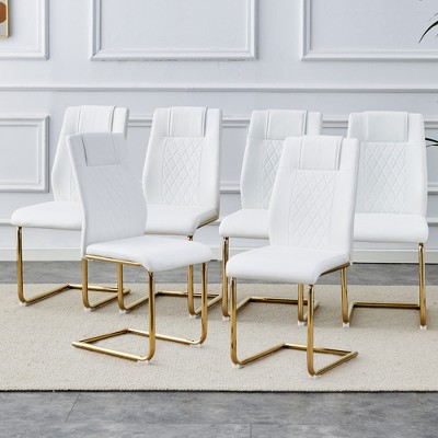 Elevate your space with Gulches Modern Dining Chairs (Set of 4)¡ªwhere style meets practicality. Crafted with crisp white PU leather, these chairs are waterproof, stain-resistant, and easy to clean, ideal for busy households. The high-density sponge seats deliver lasting comfort, while the chic gold metal legs add a touch of elegance and stable support. With a 4-piece design, they¡¯re perfect for dining rooms, offices, or living areas, and assembly takes just 10-15 minutes with included tools. Versatile, durable, and comfortable¡ªthese chairs blend seamlessly with any decor for everyday use or special occasions.