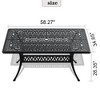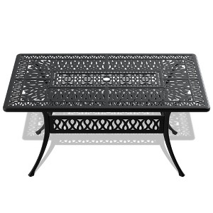 Enhance your outdoor dining area with the Gulches Patio Dining Tables, featuring a 58.27" L x 34.65" W rectangular table in a sleek black finish. This table is designed with exquisite carved patterns, adding elegance and charm to your patio. It includes a convenient umbrella hole for added shade on sunny days. With a height of 28.35" and a weight of 47.66 lbs, it comfortably seats six, making it perfect for family gatherings. Easy to assemble with all necessary tools included, this table combines style and practicality for your outdoor enjoyment.