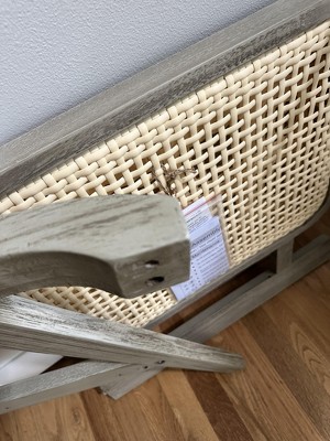 The back is yellow, the cushions are tan and the wood has a greenish hue. It's nothing like the online pictures.