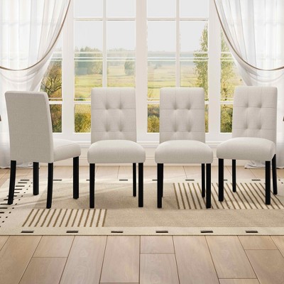 Gulches set of 4 modern tufted dining chairs in beige feature linen upholstery with textured appearance adding depth and visual interest the black rubber wood curved legs not only enhance aesthetic appeal but also ensure stability the standout tufted back design brings sophisticated chic look that complements modern contemporary and mixed home decor elevating overall elegance each chair has soft elastic sponge filled seat cushion providing excellent comfort while the breathable linen fabric keeps you cool even in warm weather the ergonomically designed tufted back supports your spine reducing fatigue making it enjoyable to sit for extended periods versatile in use they are perfect for dining room kitchen living room and bedroom suitable for family dinners weekend brunches parties and extra seating needs blending style comfort functionality and exquisite appearance these chairs are a versatile addition to any home space