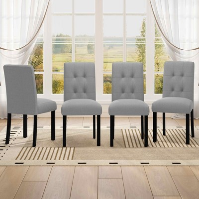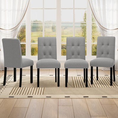 Gulches set of 4 modern tufted dining chairs in gray feature rustic linen upholstery with textured surface adding depth and visual appeal the black rubber wood curved legs combine aesthetic charm and stability while the standout tufted back design brings sophisticated chic look that complements modern contemporary and mixed decor styles elevating overall home elegance as a neutral color option the gray variant offers versatile matching with various color schemes seamlessly blending with your dining table and overall home decor the cohesive design of curved legs and tufted back creates a visually pleasing appearance that will impress your guests versatile in application these chairs are perfect for dining room kitchen living room and bedroom suitable for family dinners weekend brunches parties and extra seating needs balancing functionality and stylish design they are a practical and elegant addition to any home space