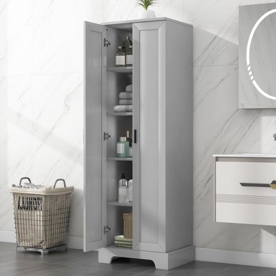This tall grey storage cabinet features premium water-proof MDF with a smooth painted finish and sturdy metal hardware for durability. It offers ample multi-tier storage via enclosed upper cabinets, a middle drawer, lower cabinet and side racks to organize daily necessities. The adjustable bottom shelf accommodates items of varying sizes, while the anti-tipping device ensures safe wall-mounted use. Versatile and functional, it works perfectly as a storage solution for bathrooms, kitchens, offices and more.