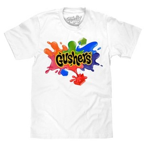 A Sweet 90s Throwback!: Make a bold splash with this nostalgic candy t-shirt featuring the colorful Gushers logo - tastefully printed on a soft, white cotton tee.