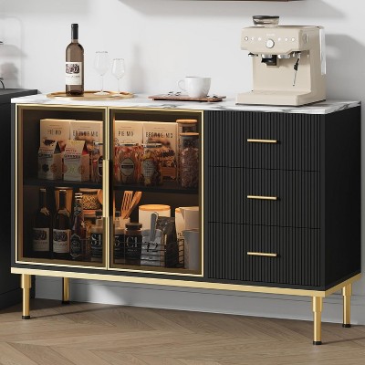 GustoWave 46.4 in Fluted Kitchen Sideboard Cabinet with 2 Glass Doors 3 Drawers and Shelves, Faux Marble Top Buffet Table, Black