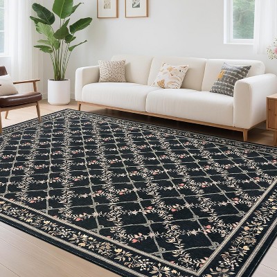 GustoWave 5' x 7' Modern Floral Machine Washable Indoor Waterproof Area Rug for Bedroom, Living Room, Black