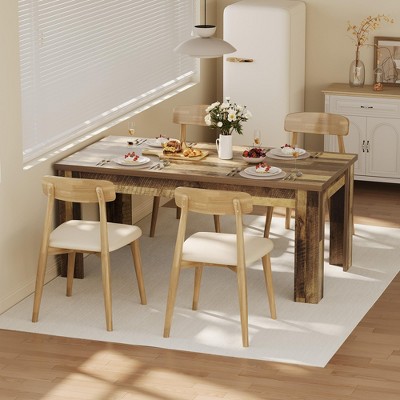 This 63"¡Á31.5" farmhouse dining table seats 4-6 with 300lb-capacity legs, featuring 1.18" reinforced MDF, tri-brace stability, scratch-proof surface, and color-coded 30-minute assembly¡ªperfect for meals or multifunctional spaces.