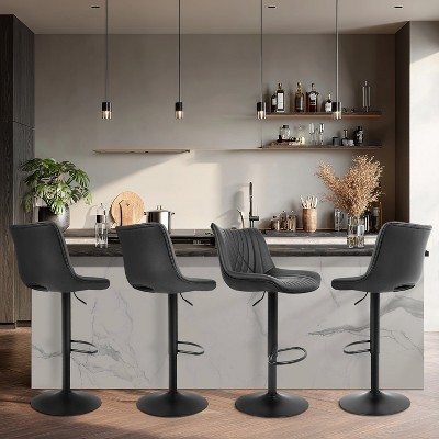 This durable bar stool set features water/scratch-proof coated surfaces for effortless wipe-clean maintenance. Ergonomic curved backrests offer lumbar support, while 16" wide seats with 4" high-density sponge ensure all-day comfort. Constructed from premium MDF and solid steel frames with stabilizing footrests, it combines industrial stability with PU leather elegance. Includes all tools/instructions for quick assembly. Versatile for homes or commercial spaces like kitchens, offices, hotels, and restaurants—blending lasting resilience (300lb+ capacity), therapeutic design, and practical elegance in any setting. (All in 1 package)