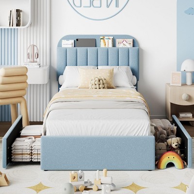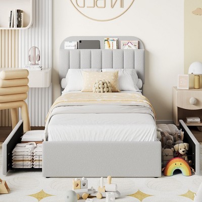 This stylish queen bed combines functionality and comfort with a smart storage headboard featuring vertical compartments for books and essentials, plus two versatile rolling drawers for under-bed organization. Upholstered in plush teddy velvet, it adds luxurious warmth to your bedroom while its sturdy metal frame and wooden slats provide silent, 1100lb-capacity support without needing a box spring. Designed with a modern channel pattern for aesthetic appeal, it arrives with labeled parts and clear instructions for easy assembly.