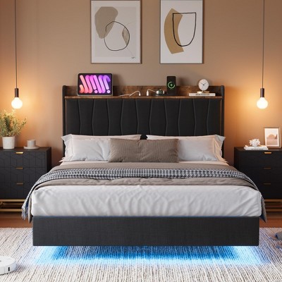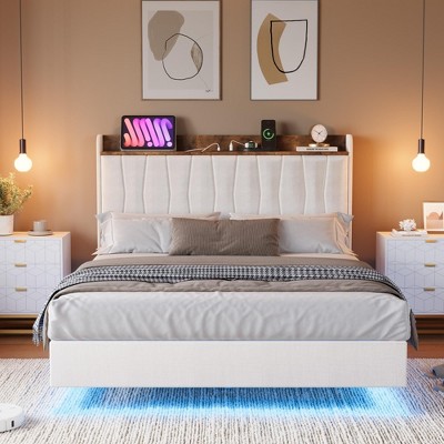 This dreamy floating full bed frame features hidden feet for a stable, levitating look and customizable under-bed RGB LED lighting with over 60,000 colors and multiple modes. The smart storage headboard includes 2 AC outlets, 1 USB, and 1 Type-C port, keeping devices charged and essentials organized. A premium linen, high-density foam headboard ensures ergonomic comfort and support, while the sturdy metal and wood slat construction, noise-reducing strips, and simple assembly guarantee a restful, quiet sleep experience.