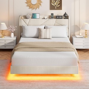 This modern floating bed frame features hidden supports for a sleek look and accessible under-bed space, customizable RGB LED base lighting, a storage headboard with built-in charging, luxurious and supportive materials with elegant copper accents, and a stable, noise-free design for lasting comfort and style.
