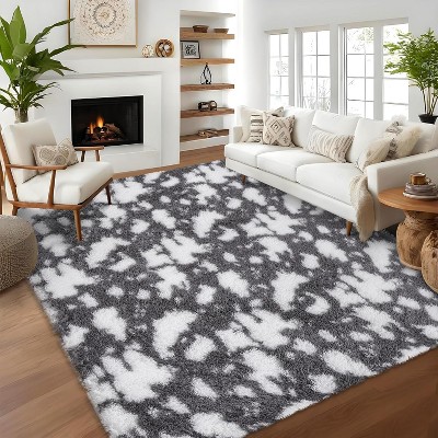 This modern, abstract rug combines soft plush fibers with a durable, low-shedding faux wool surface featuring geometric patterns, offering cushioned comfort with a non-slip TPR backing for safety, easy machine-washable care, and versatile use in multiple rooms, making it ideal for homes with children and pets.