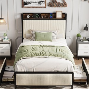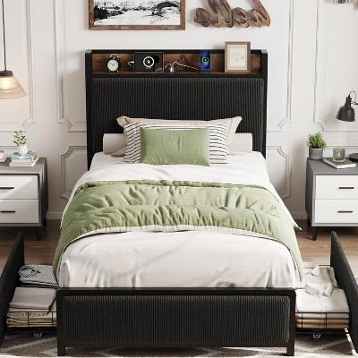 This twin bed features a linen-upholstered storage headboard with built-in fast-charging ports (2 USB + 1 Type-C), two spacious lockable drawers, and 10.6" under-bed clearance for extra storage. Flexible drawer placement allows the bed to fit flush against a wall or provide nightstand access, making it ideal for small spaces. With a sturdy, noise-free frame supporting up to 800 lbs and easy 60-minute assembly with labeled parts, this bed offers comfort, convenience, and modern style for any room.