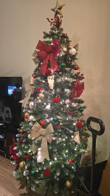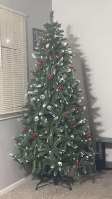 • Full silhouette with dense foliage, frosted tips, and festive accents including red berries and pinecones.