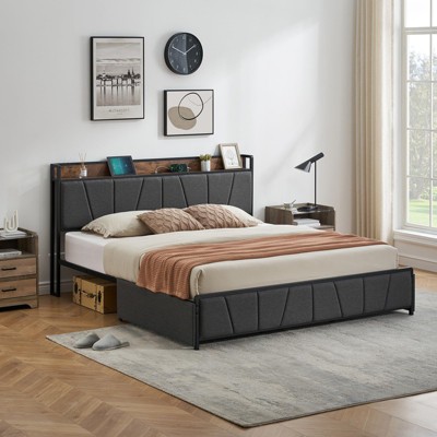 GustoWave Upholstered Platform Bed Frame with Storage Drawers & Charging Headboard - King Size, Gray