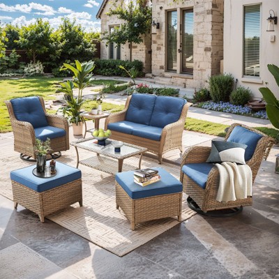 Gymojoy 5 Piece Outdoor Wicker Loveseat Sofa with Patio Swivel Glider Chairs with Coffee Table and Side Table