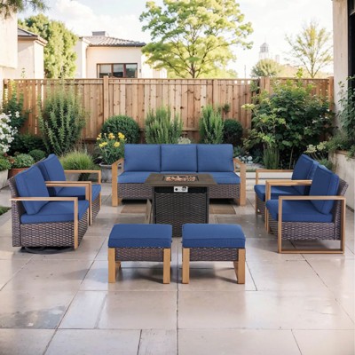 Gymojoy 5 Pieces Patio Furniture Set with Fire Pit Table - 4 Outdoor Swivel Rocker Chairs with 50000 BTU Propane Fire Pit Table, Blue Cushion