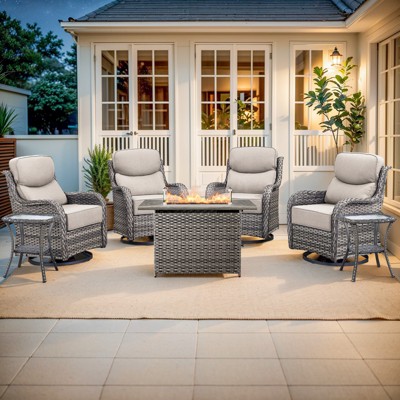 Gymojoy 7 Pieces Outdoor Patio Wicker Swivel Chair with 6 Inch Cushions and Fire Pit Table