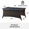 This coffee table was elegant designed with exquisite craftsmanship, All weather hand-woven wicker in traditional mixture brown or Grey tone allows you easily to mix match with other patio furnitures. This table size is 46.5"W *28.5"D * 21"H, it's big enough to match 5 seats or more furniture set.