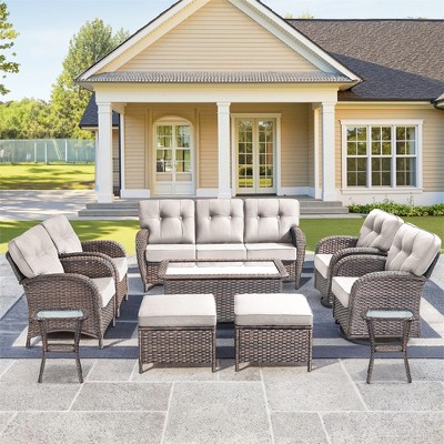 - PATIO FURNITURE SETS: This outdoor comfortable and durable wicker sofa will be widely used, fit any big or small setting and decorate your backyard, deck, balcony, porch, apartment, poolside and grand garden. Also, we offer the high-quality matching fire pits so you can enjoy the chair set all year round, from spring to winter.