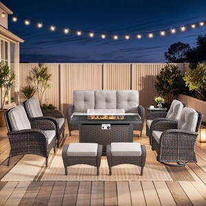 - ¡¾Patio Furniture Set¡¿Patio furniture set with fire pit table provide a spacious space for at least 2 persons and more persons to enjoy ample warmth and a romantic bonfire atmosphere. The sofa, swivel chair and ottoman constructed from all-weather
