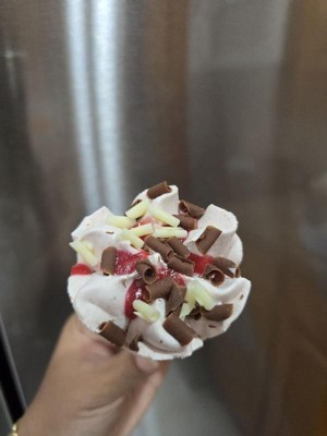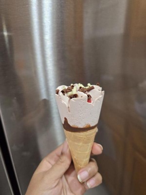 [This review was collected as part of a promotion.] This strawberry ice cream is delicious! The cute little cone was in tact when I unwrapped which I feel is rare. The cone is very delicate, like a sweet egg roll texture. I didn’t love that the cone was lined with chocolate on the inside— the chocolate flavor really drowned out the strawberry ice cream. At the bottom of the cone is a little berry jam which is a fun and tart little surprise. I liked the little curls on top. Because of the chocolate lined cone I’d prefer just the ice cream in the future but do like that this is a good serving size whereas if I bought the ice cream by itself I’d eat half or more of the pint.