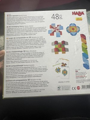 Introducing the HABA 3D Wooden Cube Mosaic Puzzle, the perfect STEM educational toy for toddlers aged 3 and up! This vibrant 48-piece wooden block set is not just any stacking toy - it's a gateway to endless creative possibilities. With double-sided template cards included, your little one can explore different patterns and designs, promoting imaginative play and developing fine motor skills along the way. Made from quality wooden construction, this Montessori-inspired toy is not only durable but also eco-friendly, ensuring safe playtime for your little builder. Ideal for preschoolers, this hands-on learning toy encourages problem-solving and cognitive development in a fun and engaging way. Watch as your child discovers basic geometric shapes through play, laying the foundation for STEM learning at home. Designed to spark creativity and curiosity, the HABA 3D Cube Mosaic Puzzle is more than just a toy - it's a tool for learning and growth. Give your child the gift of learning through play with this educational stacking toy. Whether they're following the templates or creating their own designs, this toy is sure to provide hours of entertainment and skill-building fun. Invest in their future with this wooden toy that promotes learning, creativity, and cognitive development. Order now and let the learning adventures begin! Cleaning Instructions: HABA recommends using a cloth lightly dampened with warm water. If you wish to disinfect the toy with a cleaning agent, use a small amount of either water and a mild dish soap or a water & vinegar essence mix. Both options work extremely well in destroying bacteria and cleaning wooden toys. After cleaning, wipe the toy dry with a clean cloth. Remember, Wood is a natural material that soaks in moisture. Do not ever submerse wooden toys in water or place in a dishwasher. Disinfectants (even organic baby wipes), should not be used as they can damage the water based protective coatings applied to protect the stains or paints beneath.