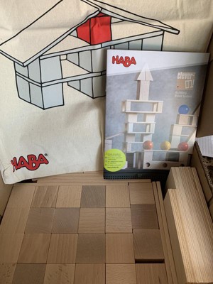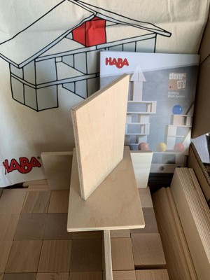 Welcome to HABA's Clever Up! Building System. As children grow, the Clever Up! system grows with them. Start with Clever Up! 1.0 and each consecutive system adds shapes of a higher degree of complexity culminating in the Clever Up! 4.0 set which includes spheres and perforated slats to balance the spheres. Each set includes a double handle fabric storage bag and a full color instructional booklet teaching parents how to help use blocks to build a child's math, geometry and even physics skills. Children use the building blocks to playfully shape the space around them and at the same time begin to grasp the concept of the third dimension. Through constant repetition and trial and error, they also acquire an empirical understanding of the laws of physics. Cleaning Instructions: HABA recommends using a cloth lightly dampened with warm water. If you wish to disinfect the toy with a cleaning agent, use a small amount of either water and a mild dish soap or a water & vinegar essence mix. Both options work extremely well in destroying bacteria and cleaning wooden toys. After cleaning, wipe the toy dry with a clean cloth. Remember, Wood is a natural material that soaks in moisture. Do not ever submerse wooden toys in water or place in a dishwasher. Disinfectants (even organic baby wipes), should not be used as they can damage the water based protective coatings applied to protect the stains or paints beneath.