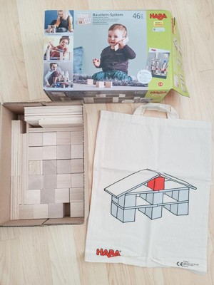 HABA Building Block System- Clever Up! 1.0-46 Wooden Pieces with Educational Booklet & Sturdy Storage Bag- Ages 1 and Up Made in Germany