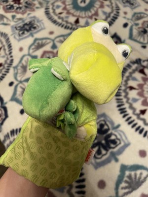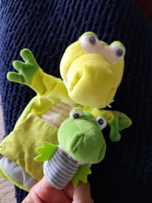 [This review was collected as part of a promotion.] My son absolutely loves this finger puppet. The first day he saw it he had to carry it around everywhere. Its nicely made material and it fits pretty good on my hand and there is a baby puppet that fits on my sons hand perfect. Also the little puppet fits in the pouch of the big puppet.