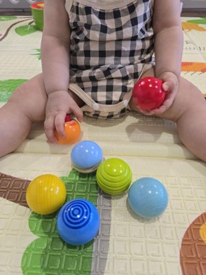 [This review was collected as part of a promotion.] Open first glance as in the photo these toys are a great size!! They’re very compact and the design with the different colors is very appealing to my baby! The safety features of the items are rounded so they won’t be sharp for babies! They’re very durable and they helped my baby with mobility. They’re very educational.