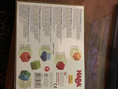 Perk up your ears! A lot of different sounds can be heard. Squeaking, clacking, rattling, tinkering.. each cube awaits with a different acoustic effect. In this way, early perception and musicality are fostered. Contents: 6 discovery blocks with different acoustic effects. Pieces made of solid beech wood and colored with a non-toxic water based stain. Cleaning Instructions: HABA recommends using a cloth lightly dampened with warm water. If you wish to disinfect the toy with a cleaning agent, use a small amount of either water and a mild dish soap or a water & vinegar essence mix. Both options work extremely well in destroying bacteria and cleaning wooden toys. After cleaning, wipe the toy dry with a clean cloth. Remember, Wood is a natural material that soaks in moisture. Do not ever submerse wooden toys in water or place in a dishwasher. Disinfectants (even organic baby wipes), should not be used as they can damage the water based protective coatings applied to protect the stains or paints beneath.